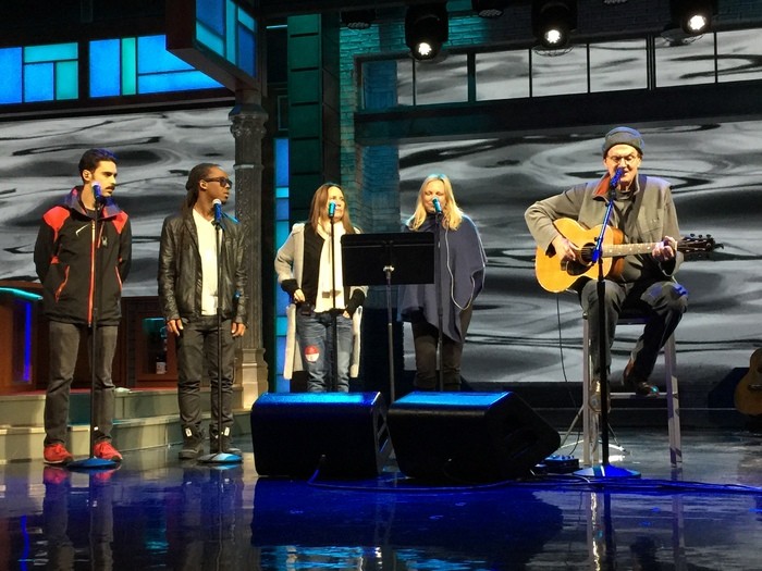 - Working out the “Fire & Rain” lyrics… 5 minutes before taping! (Photo by Ellyn Kusmin).