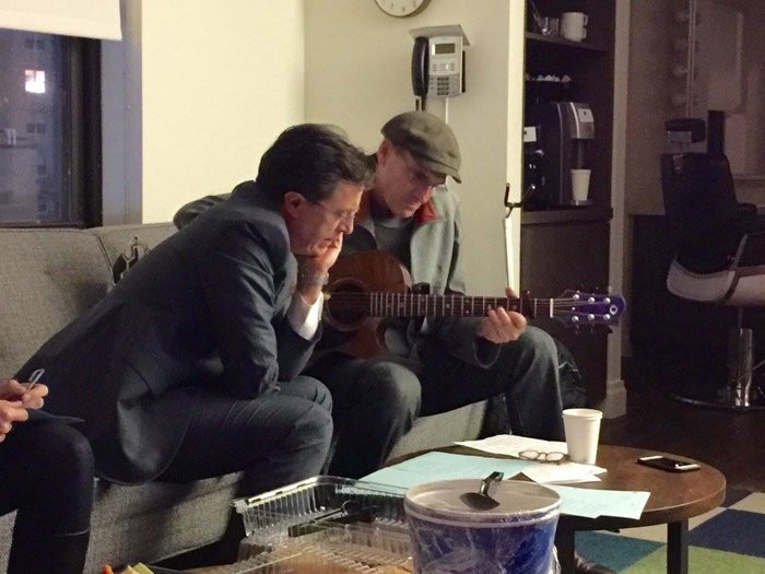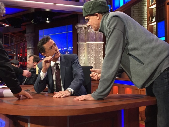 - James rehearsing with Stephen Colbert. (Photo by Ellyn Kusmin)